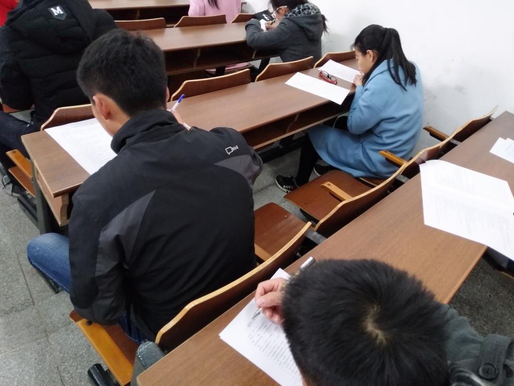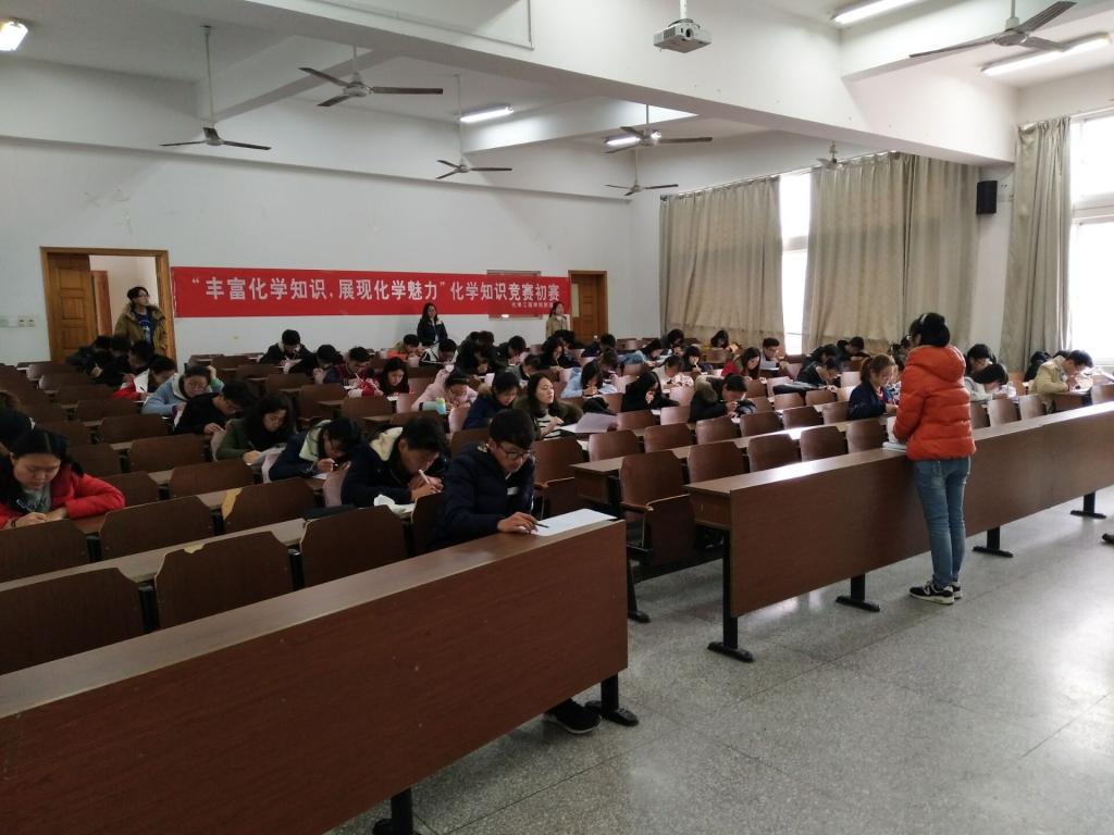 在开考前四十分钟,两个考场基本上座无虚席,考生认真准备接下来的考试。参赛选手来自全校各个专业,更多的是非涉化专业,活动旨在宣传生活化学常识知识,丰富老员工的化学知识。本次知识竞赛两两组队,最终以两名队员的成绩和排名取十支队伍进入决赛。每一位参赛选手脸上容光焕发,信心满满,都有志挺进决赛。考试正式开始前,主任王璐璐为大家认真讲述考试过程中的一些细节,并鼓励在场的每一位同学赛出水平,赛出风格。比赛伊始,同学们立即埋头奋笔疾书,答题稳重,认真仔细地分析了每一题的诸多细节,不放弃每一道题。停考后,参赛选手有序离场。