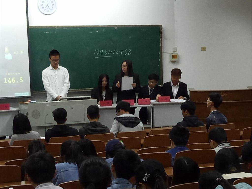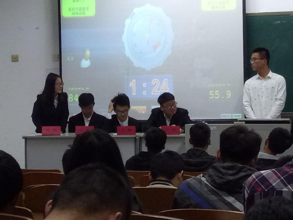 4月23日晚上7时,高材151班与环工151班在主楼102举办辩题为“肉体出轨接和精神出轨哪个更让人接受不了”的辩论赛,化院团委员工主席王瑞,办公室部长谷宇恒,实践部部长魏童童。组织部部长王新,副部朱亚晴,宣传部副部夏祥参与本次活动,高材151、环工151班全体参加,杨晨宇担任本次辩论赛主持人。