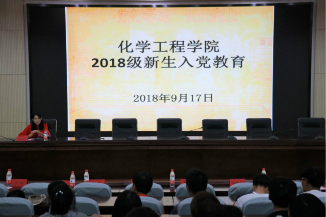 9月17日16时30分,化学工程学院2018级新生入党教育于黄海厅准时举行。党务秘书杨文娜及各系正副主任、新生班班主任、行政办负责老师、专业辅导员出席本次会议,2018级全体新生参加本次会议。党委副书记王改红担任本次会议主持人。