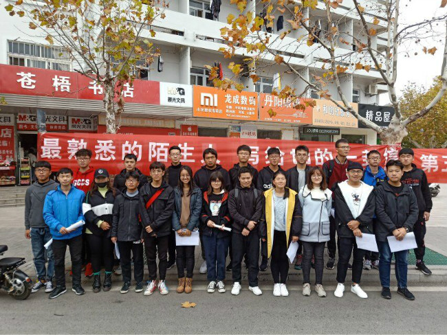 活动伊始,新媒体成员纷纷前往一食堂对面,有条不紊的进行活动场地的布置。接着,进行宣传的同学拿着宣传单到各个路口向同学们介绍本次活动,希望他们能积极参与到活动中。路过的同学纷纷驻足,积极参加活动。活动最后,新媒体工作人员在横幅前合影留念。