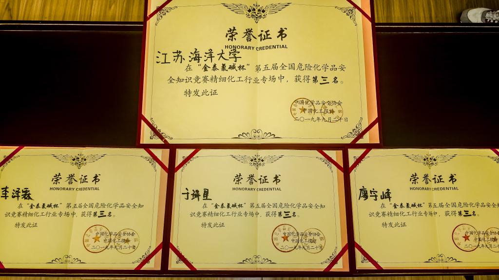 9月19日下午六时,化学工程学院安全工程系张兰君博士带领廖宇峰、李泽霖、于瑞星三位同学赴江苏省新沂市参加“金泰氯碱杯”第五届全国危化品——精细化工专场安全知识竞赛。