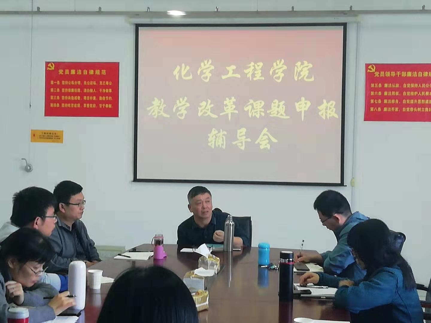 10月24日下午,化学工程学院在主楼1006召开了2019年度教学改革课题申报辅导会。此次会议由化学工程学院经理张东恩主持,邀请了原化学工程学院副经理马卫兴教授来作辅导,参加此次会议的还有各系及实验中心的教师。