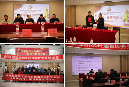 首先,材料教师党支部与安北村党总支举行“富民兴村、结对共建”签约仪式,安峰镇安北村党总支书记李从江、材料科学与工程系教师党支部书记班鑫鑫代表双方在共建协议书上签字。仪式上,协议双方对“结对共建”的意义予以充分肯定,并一致表示要以党建共建为契机,加强学习交流,把党的政治优势化为双方共同发展、共同进步的实际行动。重点围绕共同为群众办一件实事,共同上一次党课,进行一次联合组织生活会,共同进行一次党建共建促膝谈“四个一”积极开展共建活动。