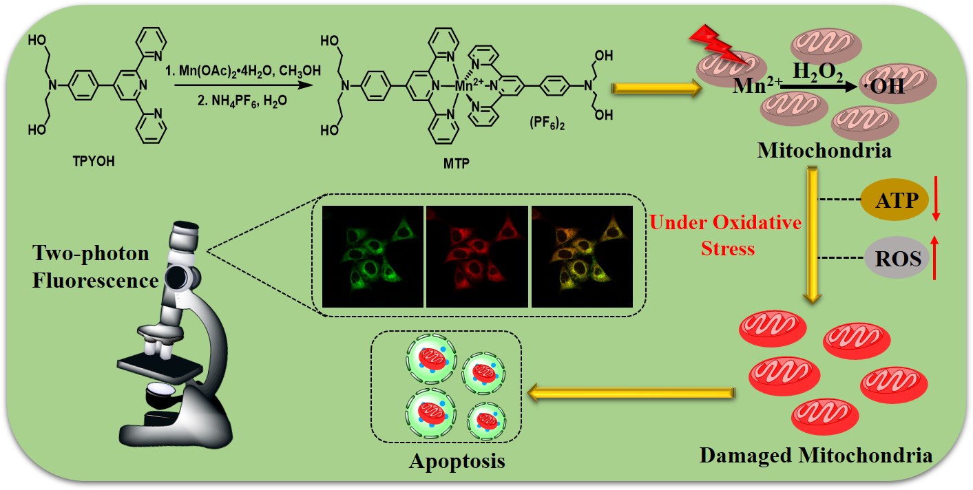四、应用化学专业杨欣达以共同第一作者的身份于Chem. Commun.期刊上发表了相关研究论文。该论文基于现有抗肿瘤药物选择性差、毒副作用大等问题,设计了一种具有双光子光动力治疗活性且成功靶向肿瘤细胞线粒体的三联吡啶锰配合物。双光子激发条件下该配合物可以在肿瘤细胞中产生ROS,使肿瘤细胞内ATP含量明显下降,呈现出良好的光动力治疗效果。这也是目前首例锰配合物具有双光子激发PDT效果的报道。