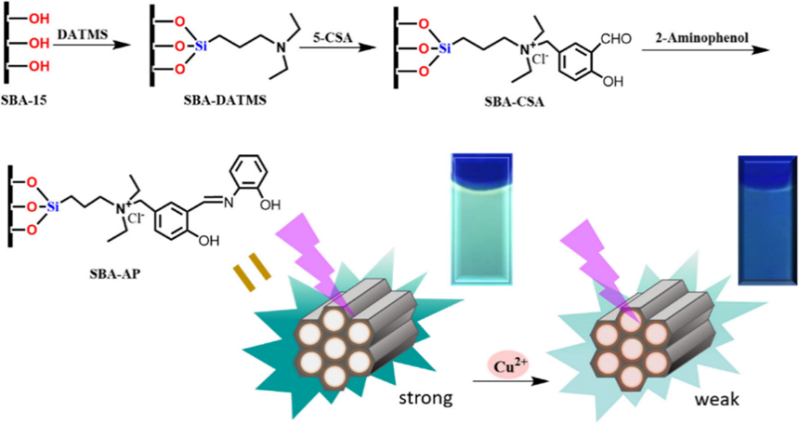 图7 有机-无机杂化荧光探针SBA-AP的制备示意图以及在Cu(II)存在下的荧光响应