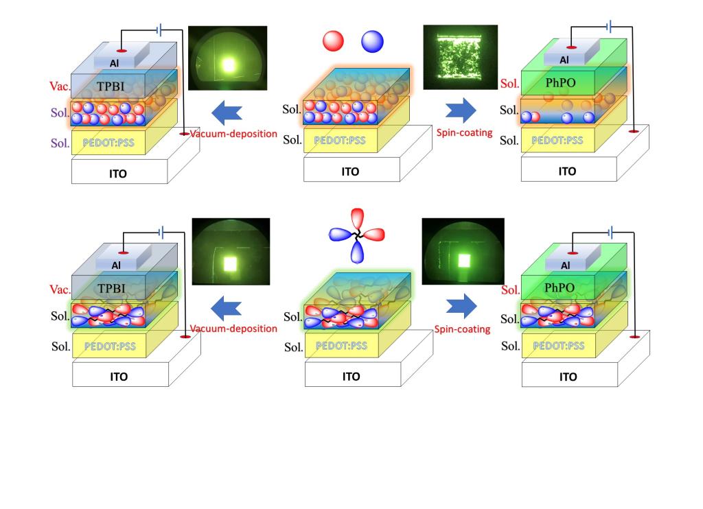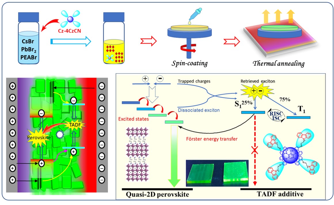 3. 近期,二维钙钛矿材料在能源、激光、LED、光电探测器等领域受到广泛关注。班鑫鑫老师的团队创新性开发树枝状延迟荧光材料作为功能型添加剂,研究结果表明,优化后的钙钛矿发光二极管的效率提高5倍,稳定性性提高了2倍。首次证明了TADF树枝状大分子是一种有效的激子回收型添加剂,可以通过钝化缺陷、填充晶界和回收激子等途径提高钙钛矿发光二极管的器件性能。此外,该类树枝状TADF在有机荧光探针领域也表现出十分优异的性能。相关成果发表在ACS Appl. Mater. Interfaces, 2021, 13, 44585-44595;Appl. Phys. Lett. 2021, 119, 242101; Dyes and Pigments, 2022, 198, 109970。