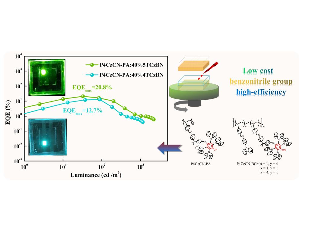 1. 聚合是提高传统小分子延迟荧光材料溶液法加工性能的可行方法,通过将聚集诱导荧光增强效应(AIE)引入聚合物材料的分子设计中,开创性的使用苯腈基团作吸电子基团设计合成了一系列具有高三线态TADF聚合物。该类AIE-TADF聚合物可有效抑制自身的浓度猝灭问题,并且合成工艺简单,无需任何贵金属催化剂或高沸点溶剂,为开发低成本、易于合成的聚合物发光材料提供了可行方案。成果发表在J. Mater. Chem. C, 2022, 10, 2109-2120。