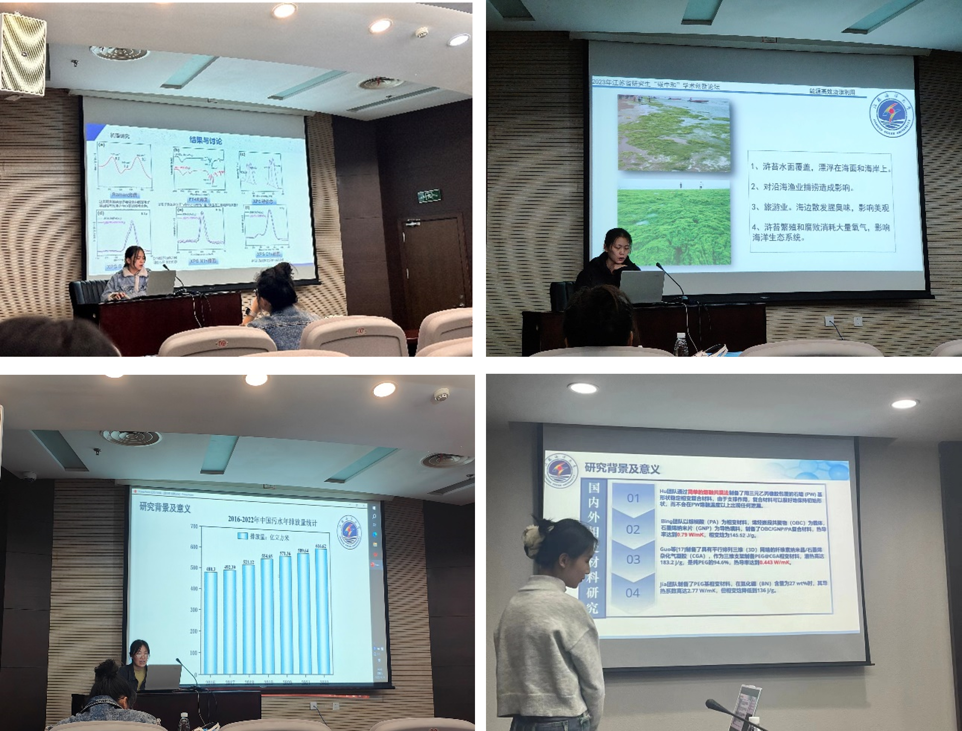 公司研究生陈冯钰以《高稳定、超可调MOF平台用于高效碘吸附》、郭会琳以《MoS2/BiOBr/PVDF-HFP压电光催化膜降解水中有机污染物的性能研究》、司方媛以《预处理对浒苔燃烧灰分及结渣行为的影响》、刘克岭以《生物质催化热解耦合热解炭活化的多联产技术》、董理以《层状材料剥离组装产生的光功能多层螺旋纳米管》、郭俊瑕以《高导热定形相变复合材料的制备及机制研究》、王政以《Cu基LDH/rGO复合材料催化温和条件下CO2的高效转化》、苏朋月以《碱激发胶凝材料固化/稳定化铬渣的实验研究》为题分别做了报告。会上与来自南京理工大学、中国矿业大学等高校的师生围绕催化材料、相变材料、导热材料的制备、改性及性能表征等方面进行了充分交流。