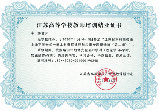 12月5日-12月6日,2020年江苏省本科高校线上线下混合式一流本科课程建设与应用专题研修班(第五期)在南京举行。公司教师李娜参加本次研修班,并顺利获得培训结业证书。