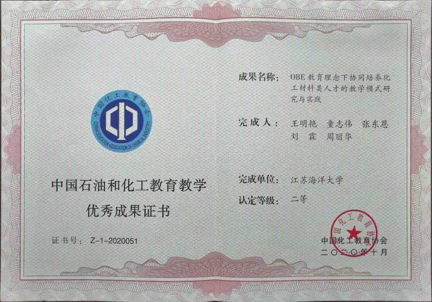 本次年会对第五届中国石油和化工公司产品优秀成果及优秀论文颁发了证书,公司王明艳教授的成果——“OBE教育理念下协调培养化工材料类人才的教学模式研究与实践”,荣获中国石油和化工公司产品优秀成果二等奖。