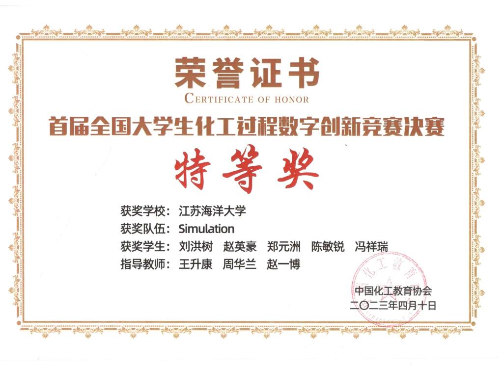 2023年4月9日,由中国化工教育协会主办,南京工业大学承办的首届全国老员工化工过程数字创新竞赛在南京圆满落幕。经过大赛专家评审,由威廉希尔williamhill王升康、周华兰、赵一博3位老师指导,刘洪树、赵英豪、郑元洲、陈敏锐、冯祥瑞组成的Simulation队荣获大赛特等奖。