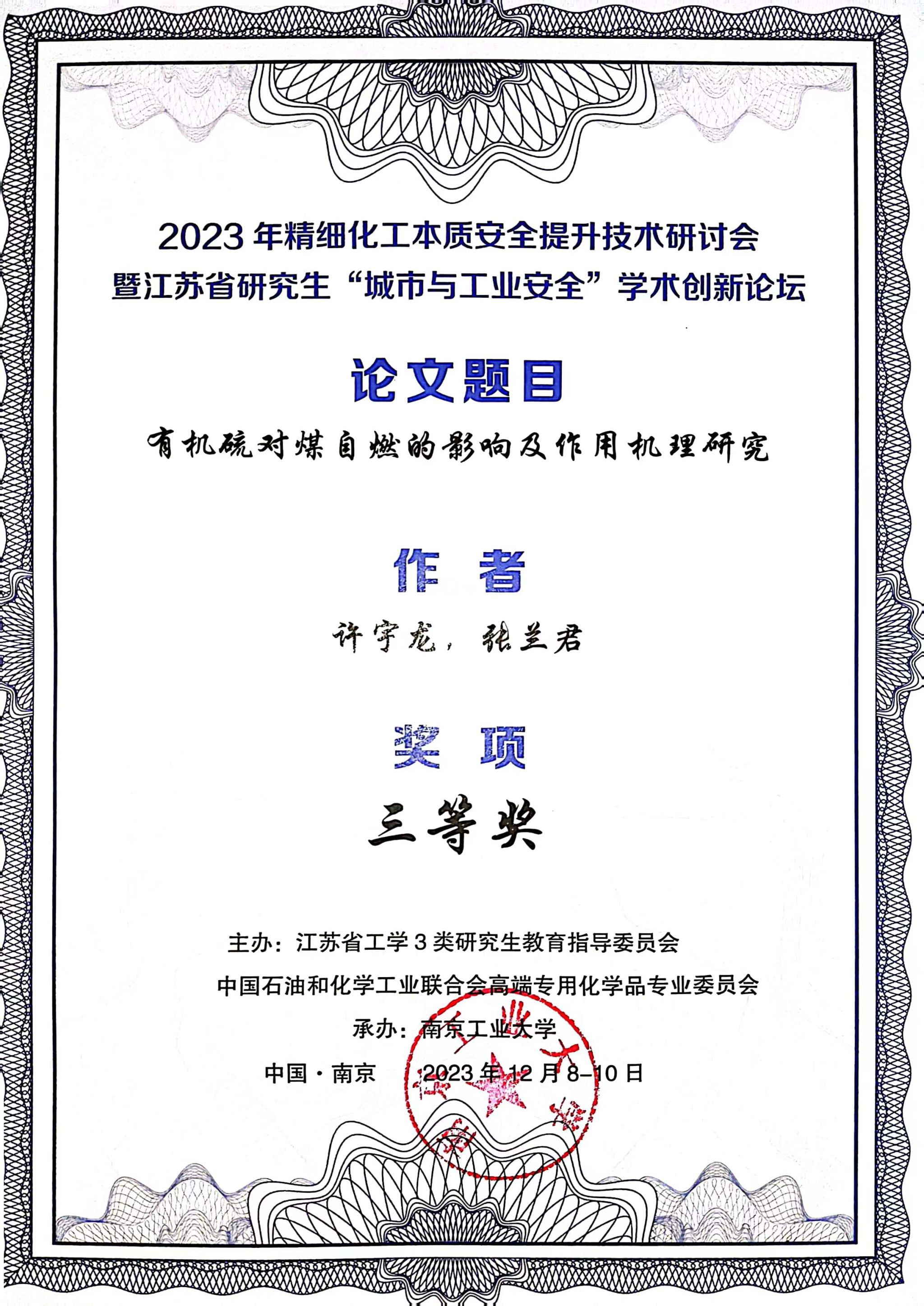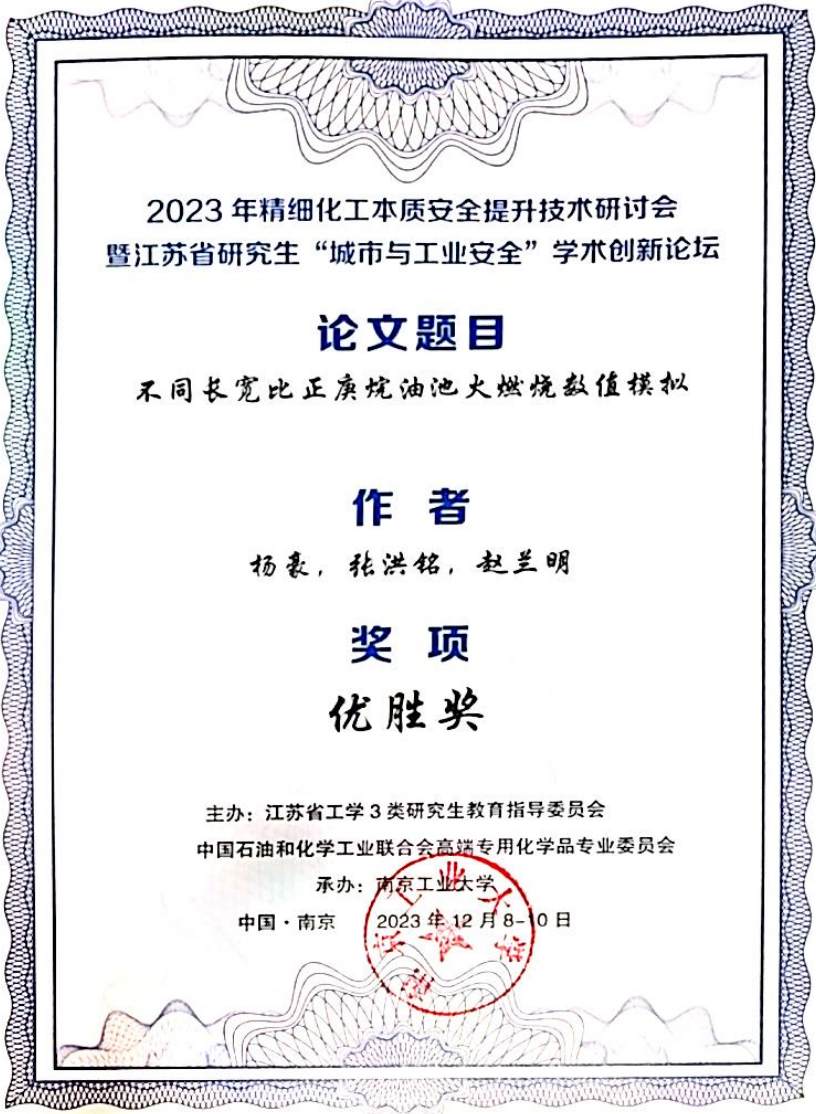 论坛聚焦精细化工、公共安全等方向面临的挑战及机遇深入探讨,共谋“产才融合”目标下的化工安全科技发展。公司由张兰君老师指导,研究生许宇龙负责的《有机硫对煤自燃的影响及其作用机理研究》在江苏省研究生“城市与工业安全”学术创新论坛荣获三等奖,并作了口头汇报,由赵兰明、张洪铭两位老师指导,研究生杨豪负责的《不同长宽比正庚烷油池火燃烧数值模拟》荣获优胜奖。